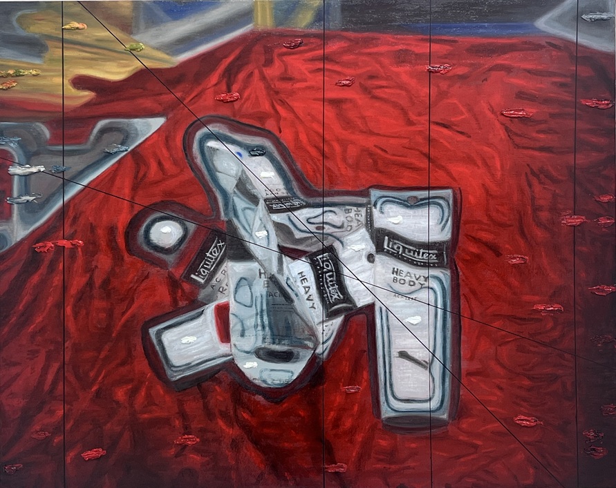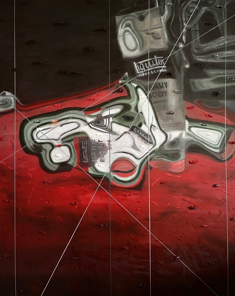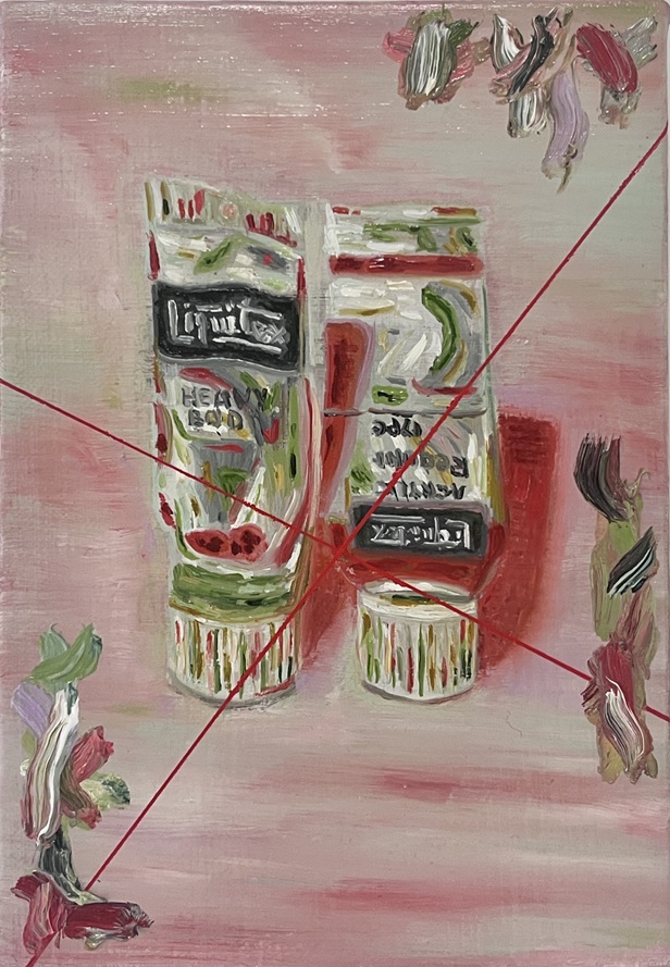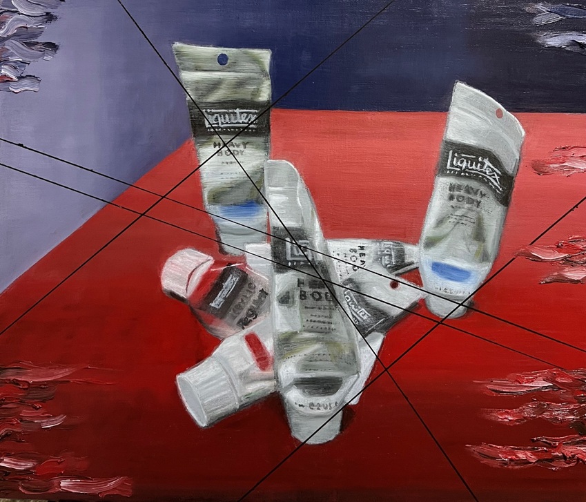 アクリル絵具を油絵具で描くことでアクリル絵具についての言及がされなくなる。アクリル絵具について思考しようとすると油絵具が現れてしまいます。それは表象を持たないモチーフ。表象を持たない絵画を描いたという点で、それは絵具のみを見せ、そこに表象を生じさせないことを表そうとし た抽象表現主義の別ヴァージョンと捉えることもできる。それは以前ジャスパー•ジョーンズが行ったジョークとも似ている。創造すること、そこに私の制作はあります。